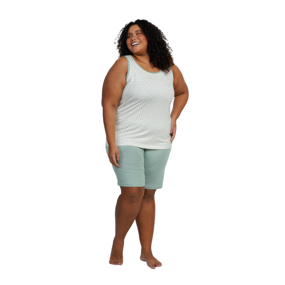Bermudoll Podiun Plus Size Cavado, possui blusa estampada em bolinhas com decote redondo, alças médias e modelagem soltinha, que acompanha a silhueta com muito conforto. Bermuda lisa com cintura intermediária, elástico embutido no cós e bolsos laterais.