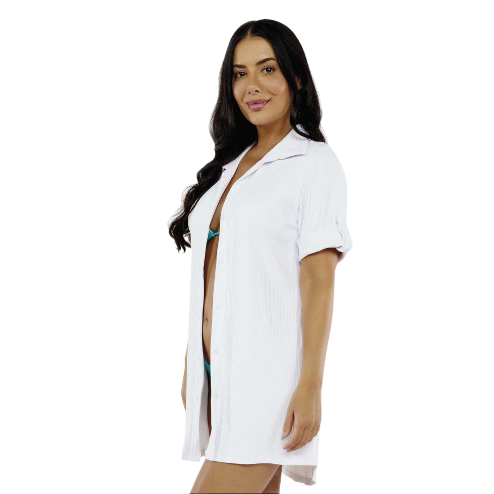 Camisão New Beach Manga Curta, possui decote em V, abertura frontal por abotoação e mangas curtas com detalhe. A peça tem textura canelada, toque suave, macio e geladinho, com ótima vestibilidade.