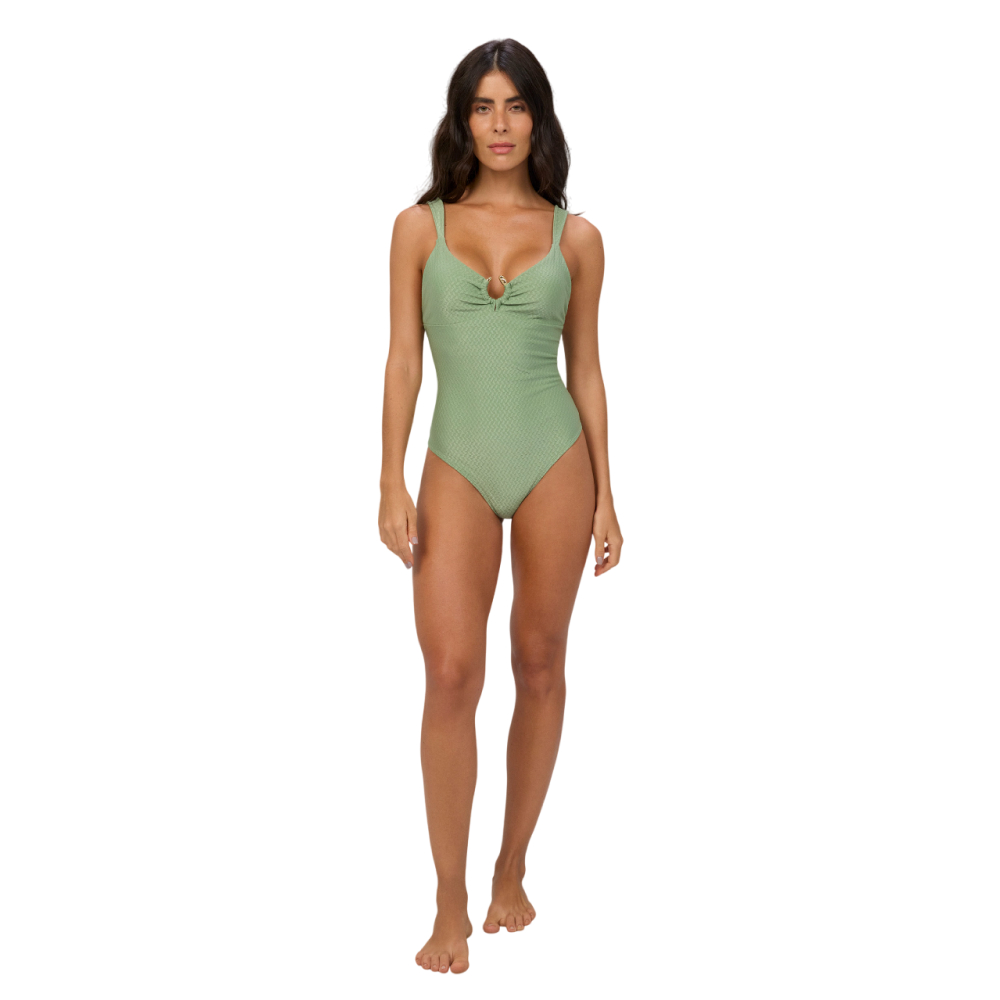 Maiô com bojo removível e alças reguláveis, garantindo conforto e ajuste personalizado, detalhe de argola metálica no entresseio que adiciona um toque moderno e sofisticado, confeccionado em tecido texturizado, levemente acetinado e com proteção UV, oferecendo mais segurança ao sol.
