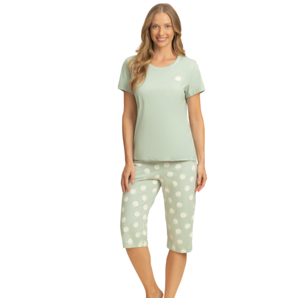 Pijama Lua Encantada Pescador Manga Curta, possui blusa com decote redondo com frisoconstrastante,e a bermuda pescador com estampa de poá lua, possui elastico na cintura. Perfeito para os dias mais quentes.