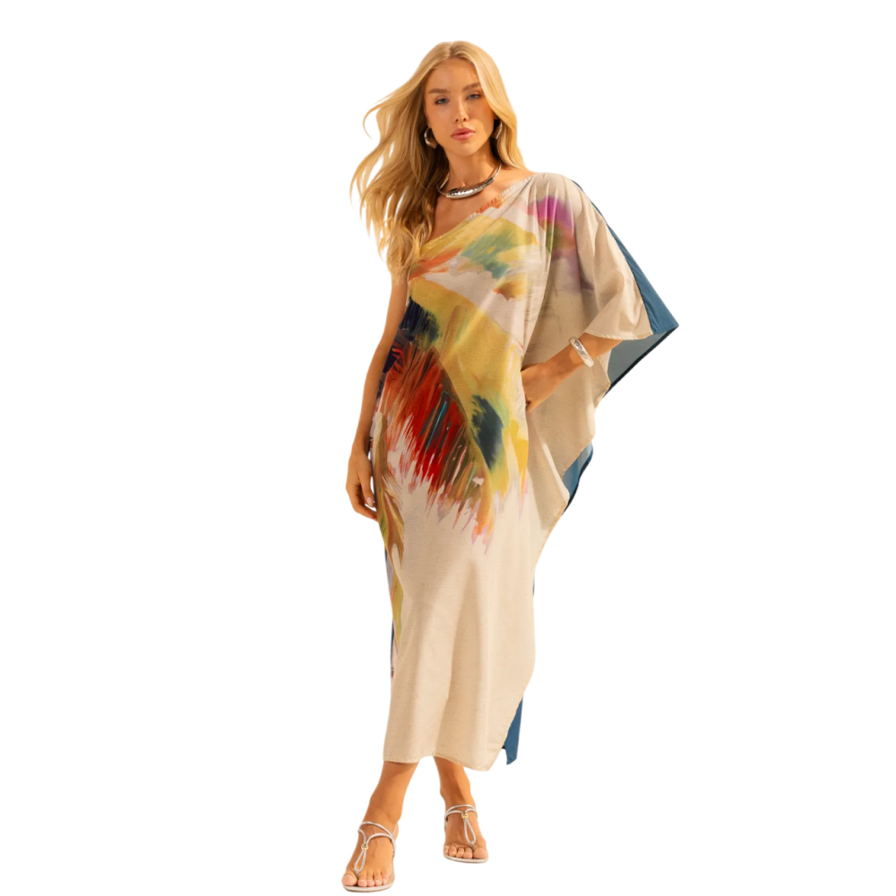 O Kaftan De Chelles Assimétrico Costa do Sol é a escolha perfeita! Com design de um ombro só, essa peça traz um toque moderno e elegante, enquanto a abertura lateral garante movimento e fluidez ao visual. Feito em crepe microfibra, o tecido possui excelente caimento, cores vibrantes e secagem rápida, proporcionando conforto e praticidade. A estampa exclusiva de maxi coqueiro, pintada à mão, reflete o frescor e a sofisticação da coleção Costa do Sol. Já a paleta de tons neutros, como azul petróleo e cru, harmoniza perfeitamente com qualquer tom de pele, tornando essa peça um verdadeiro clássico moderno.