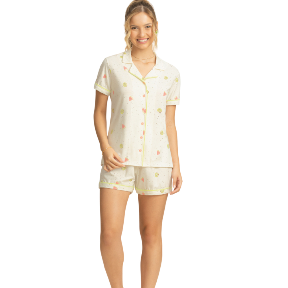 Short Doll Lua Encantada Manga Curta Com Abertura, um modelo estilo americano com abertura de botões, tornando-o a escolha ideal para as mamães que amamentam. Essa praticidade facilita o momento da amamentação, sem perder o charme. A estampa em frutinhas, adiciona um toque moderno e delicado. O viés nas mangas, na parte frontal e na barra do shorts enriquecem a peça.
